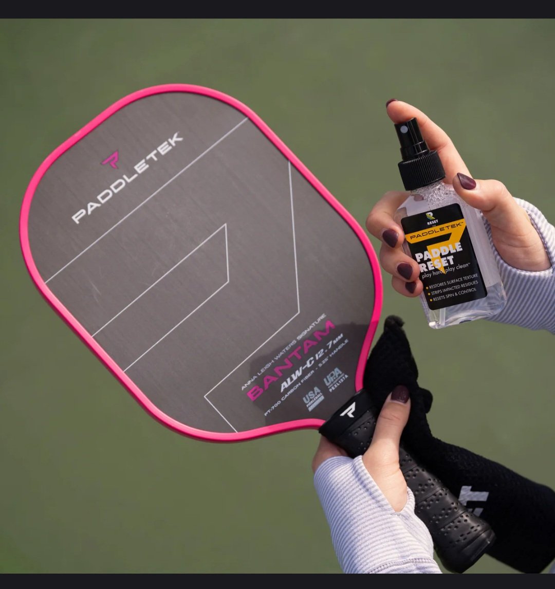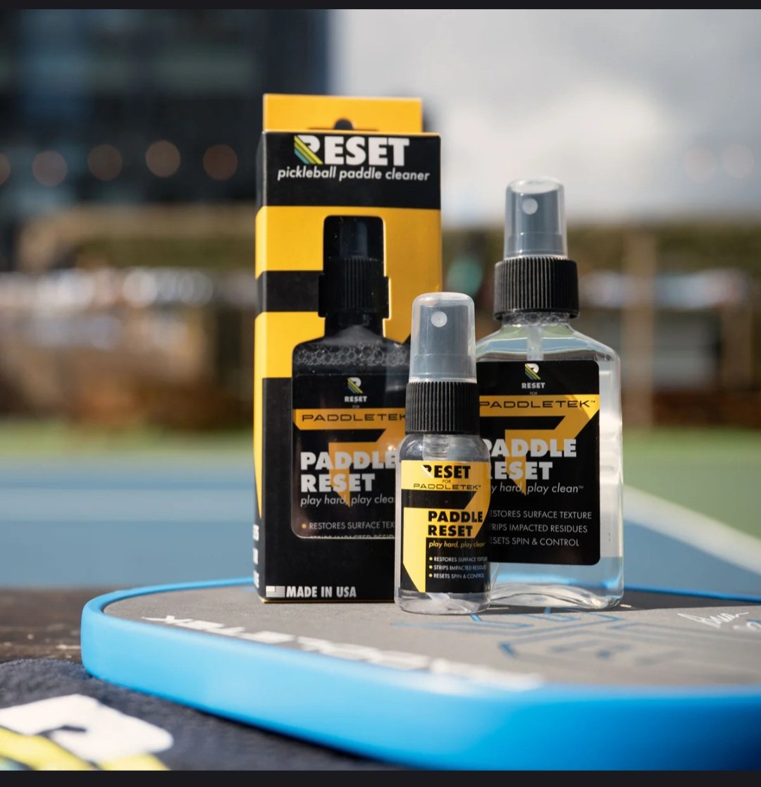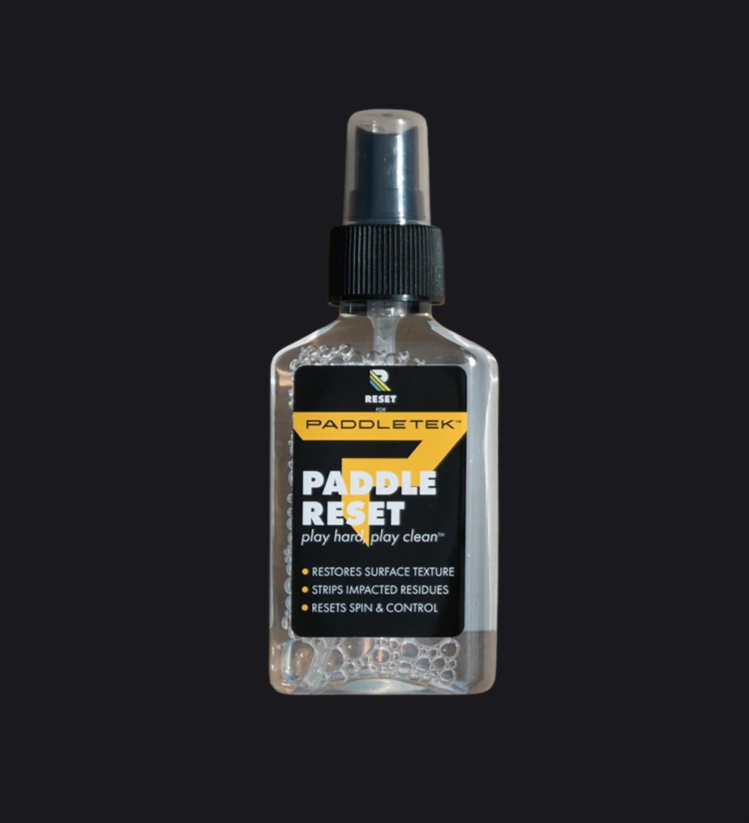 Paddle RESET is the science-backed spray to keep your paddle performing like new.Formulated with advanced restoration technology, it removes stubborn buildup better than rubber erasers, revealing the original grit and texture that gives you unmatched control and spin. Comes in a 4oz bottle.